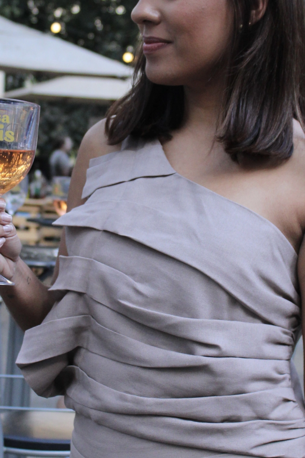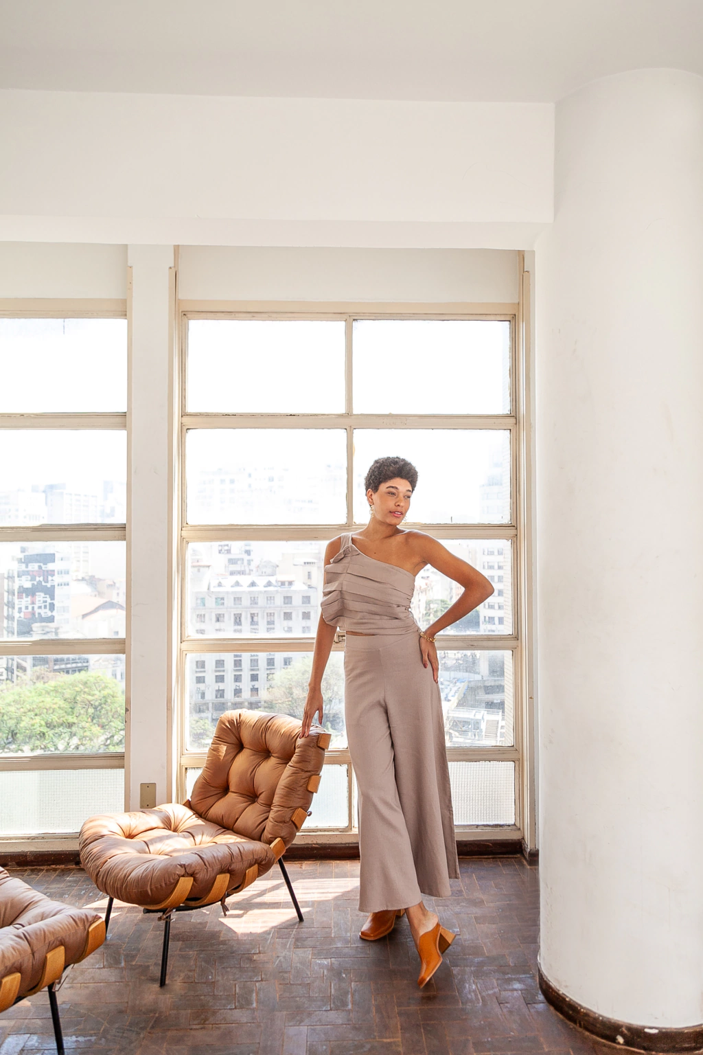 Top franzido com um ombro só, totod em linho misto e forrado em algodão. Com abertura lateral, Lindo com a Pantalona Arpoador ou mesmo um jeans.Composção : 70% viscose, 30% linho. Forro 100% algodão. Lavar à mão, não centrifugar, secar à sombra.